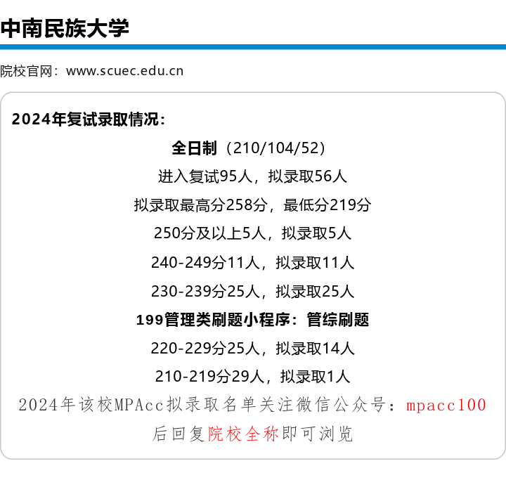 中南民族大学是直属于国家民族事务委员会的综合性普通高等院校,坐落于白云黄鹤的故乡——武汉南湖之滨。学校前身为中南民族学院,创建于1951年,2002年3月更名为中南民族大学。管理学院致力于培养管理学应用人才,用数十载春华秋实,耕耘出累累硕果。管理学院发轫于1988年创建的企业管理本科专业,历史悠久,办学经验丰富,设有工商管理(MBA)和会计(MPAcc)两个专业型硕士专业。