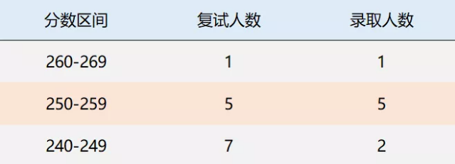 复试14人(含少干计划1人,联培项目1人),最高分260分,最低分240分;录取9人(含少干计划1人,联培项目1人),最高分260分,最低分244分。