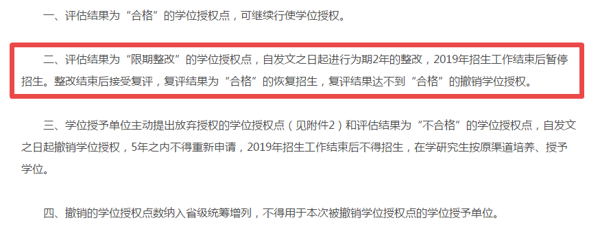评估结果为“限期整改”的学位授权点,自发文之日起进行为期2年的整改,2019年招生工作结束后暂停招生。整改结束后接受复评,复评结果为“合格”的恢复招生,复评结果达不到“合格”的撤销学位授权。限期整改的院校,2020暂停招生,考生无法报考,2019录取及之前录取的同学,不受影响,正常授课及授予学位。