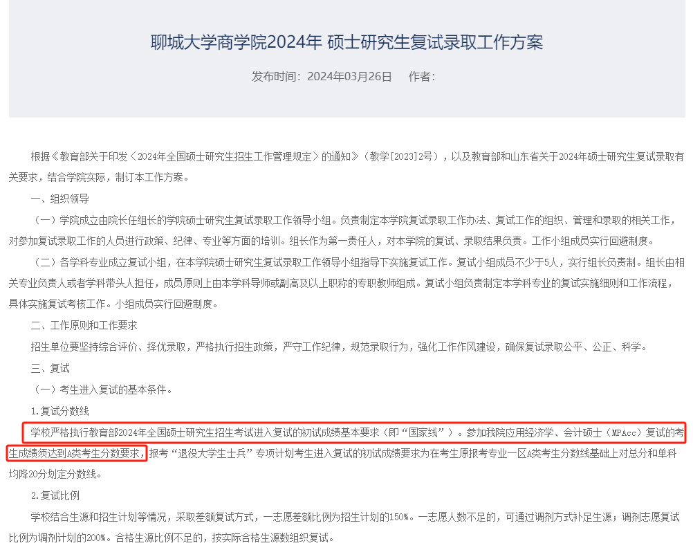 聊城大学2024年硕士研究生招生考试考生进入复试的初试成绩基本要求已公布!