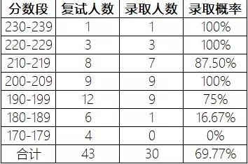 复试分数线179分。拟招收非全日制50人,实际进入复试59人,录取56人,复录比1.05。进入复试最高分240分,最低分179分;录取最高分240分,最低分179分。