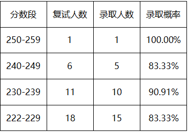 复试分数线222分。拟招收全日制18人,实际进入复试38人(含士兵计划2人),录取32人(含士兵计划1人),复录比1.16。进入复试最高分258分,最低分222分;录取最高分258分,最低分222分。