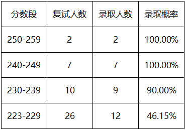 全日制复试分数线223分。拟招收27人,实际进入复试48人(含士兵计划3人),录取32人(含士兵计划2人),复录比1.5。进入复试最高分255分,最低分223分;录取最高分255分,最低分224分。